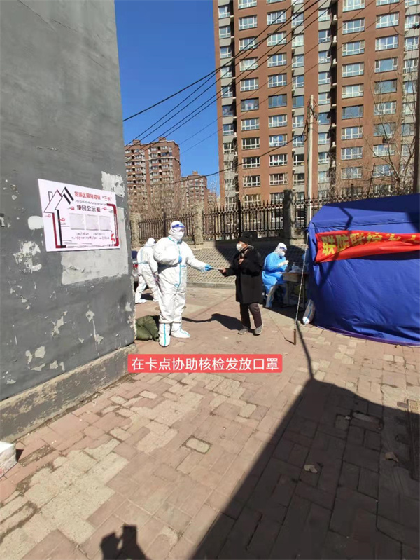 从第一批下派防疫志愿者到报名九台突击队,从奔赴绿园区重点保供一线再到投身宽城区疫情防控突击队,他已经连续奋战一个月。从支援绿园区海吉星食品批发市场转战宽城以来,他依然坚守在“卡点”岗位上,除了保障卡点的正常秩序外,他还尽力协助医护人员进行核酸检测、发放试剂盒、楼道消杀等工作;当面对无故外出的居民,他都从同理心、同情心为出发点,耐心劝返;对于不会操作智能手机和孤寡老人等特殊关照居民,他本着党员服务群众的宗旨,主动联系社区保供人员帮助其解决生活物资、买药就医等困难。卡点虽小,但关系全局,上岗数日来,共劝返居民50余人次,协调社区为居民解决急难问题4次,协助全员核酸检测、发放自测盒7次,协助上门核检1次,协助转移患者5人,接收出院2人,联系街道解决了老旧散封控区垃圾转运难的问题,受到了封控小区居民的一致好评。