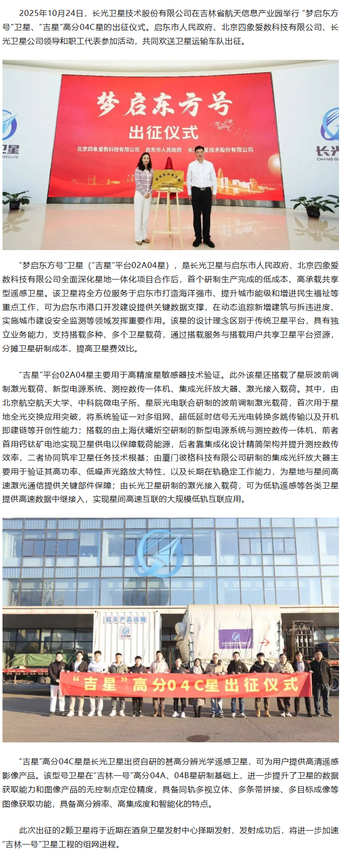 长光卫星研制!“梦启东方号”卫星、“吉星”高分04C星今日出征