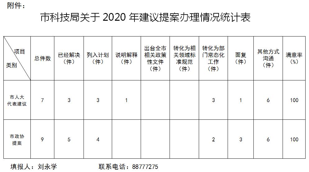 (二)规范流程。根据市政府建议提案办理工作要求,我局制定下发《关于做好2020年建议提案办理工作的通知》,明确建议提案办理流程,即事先沟通联系、搞好工作调研、起草答复意见、局领导审定把关、征询代表委员意见、形成答复文件的工作流程。依据《市政府建议提案办理工作考评细则(试行)》,制定下发《市科技局建议提案办理工作考评评分表》。统一规范建议提案答复和征询表格式,要求各处室指定专人,严格按照格式办理建议提案。